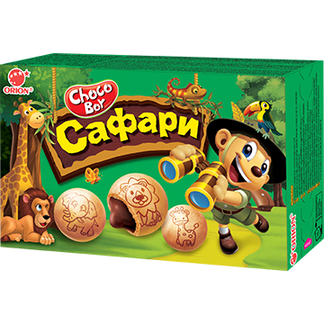 Шоколад находится внутри печенья, а веселые зверушки, нарисованные на печенье карамелью, превращают это лакомство в игру.